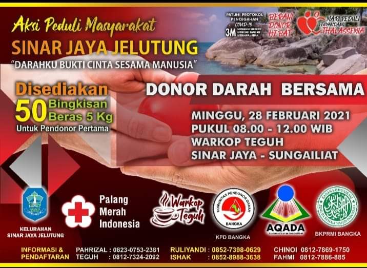 SUNGAILIAT, KABARBABEL.COM – Dalam rangka membantu pemenuhan kebutuhan darah untuk pasien di berbagai rumah sakit yang ada di Kota Sungailiat, sekelompok pemuda berinisiatif mengadakan “Aksi Peduli Masyarakat Sinar Jaya Jelutung” berupa kegiatan donor darah bersama yang akan diselenggarakan pada hari Minggu (28/2/2021) bertempat di Warkop Teguh Sinar Jaya Sungailiat.