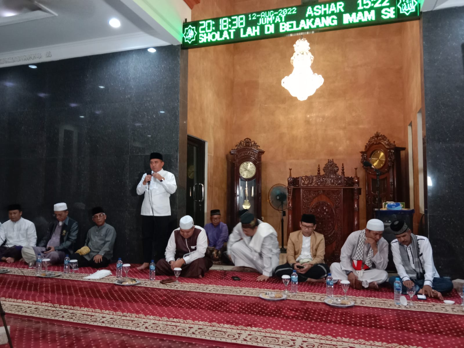 PANGKALPINANG, KABARBABEL.COM – Bersama organisasi masyarakat (Ormas) Islam, Wali Kota Pangkalpinang, Dr. H. Maulan Aklil yang kerap disapa Molen mendengarkan tausyiah Prof. M Farid Fakhrudin tentang “Semarak Muharram 1444 H” di Masjid Permuthi Kelurahan Melintang Kota Pangkalpinang, Jumat malam (12/8/2022).