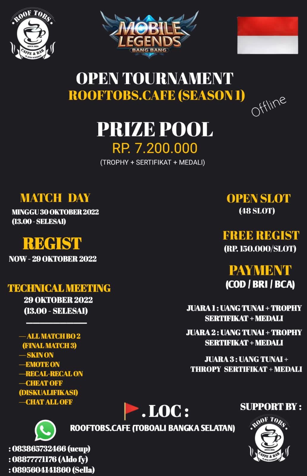 Turnamen bertajuk Open Tournament Roof Tobs Cafe Season I akan digelar dengan sistem bertemu langsung atau offline tersebut akan mendapatkan tropi, sertifikat dan medali dengan total hadiah senilai Rp7,2 juta.