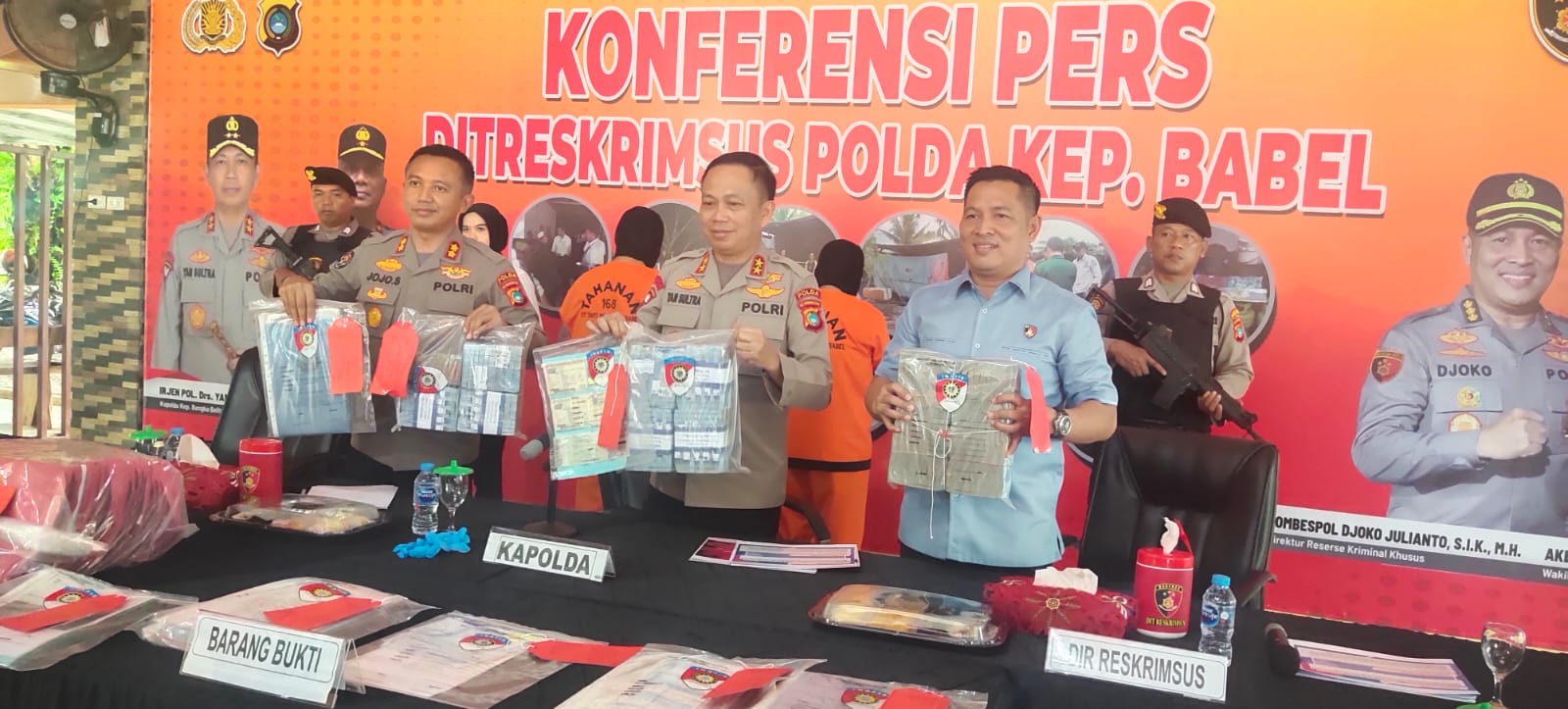 Kapolda Babel Irjen Pol Yan Sultra didampingi Dirkrimsus Kombes Pol Djoko Julianto dan Kabid Humas Polda Babel AKBP Jojo Sutarjo menyampaikan ada tiga tersangka yang di amankan KH selaku pimpinan cabang BPRS Muntok selaku eksekutor mentransfer dana pembiayaan penanaman ubi kasesa kepada 30 nasabah sebesar Rp 7.025.000.000, kemudian tersangka AL dan RD berupaya mendapatkan pinjaman pembiayaan dari BPRS.