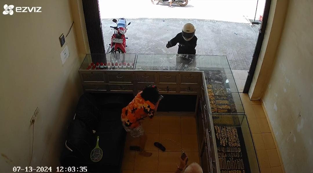 Kejadian perampokan yang sempat terekam kamera CCTV toko tersebut, memperlihatkan 1 dari 2 pelaku turun dari sepeda motor jenis matic secara cepat menggasak sejumlah emas dengan memecahkan etalase kaca.
