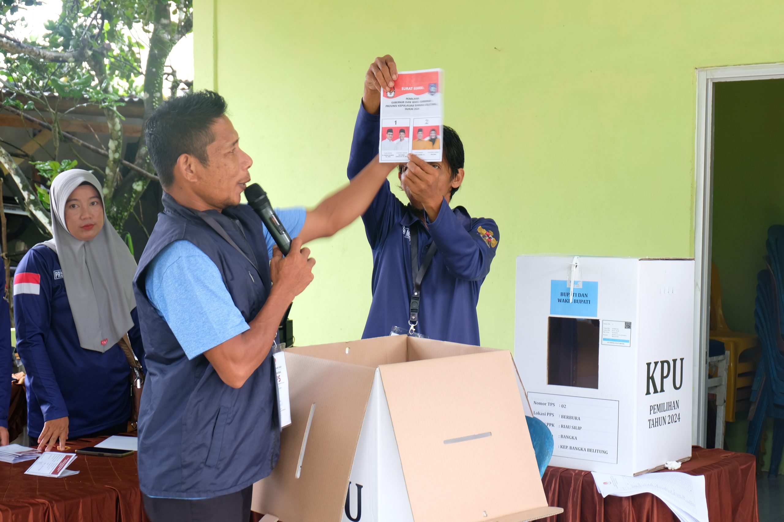 Petugas KPPS Riau Silip melakukan penghitungan suara pada Pemilihan Gubernur dan Wakil Gubernur Babel pada Pilkada Serentak, 27 November 2024. Foto : Hairul/Kabarbabel.com