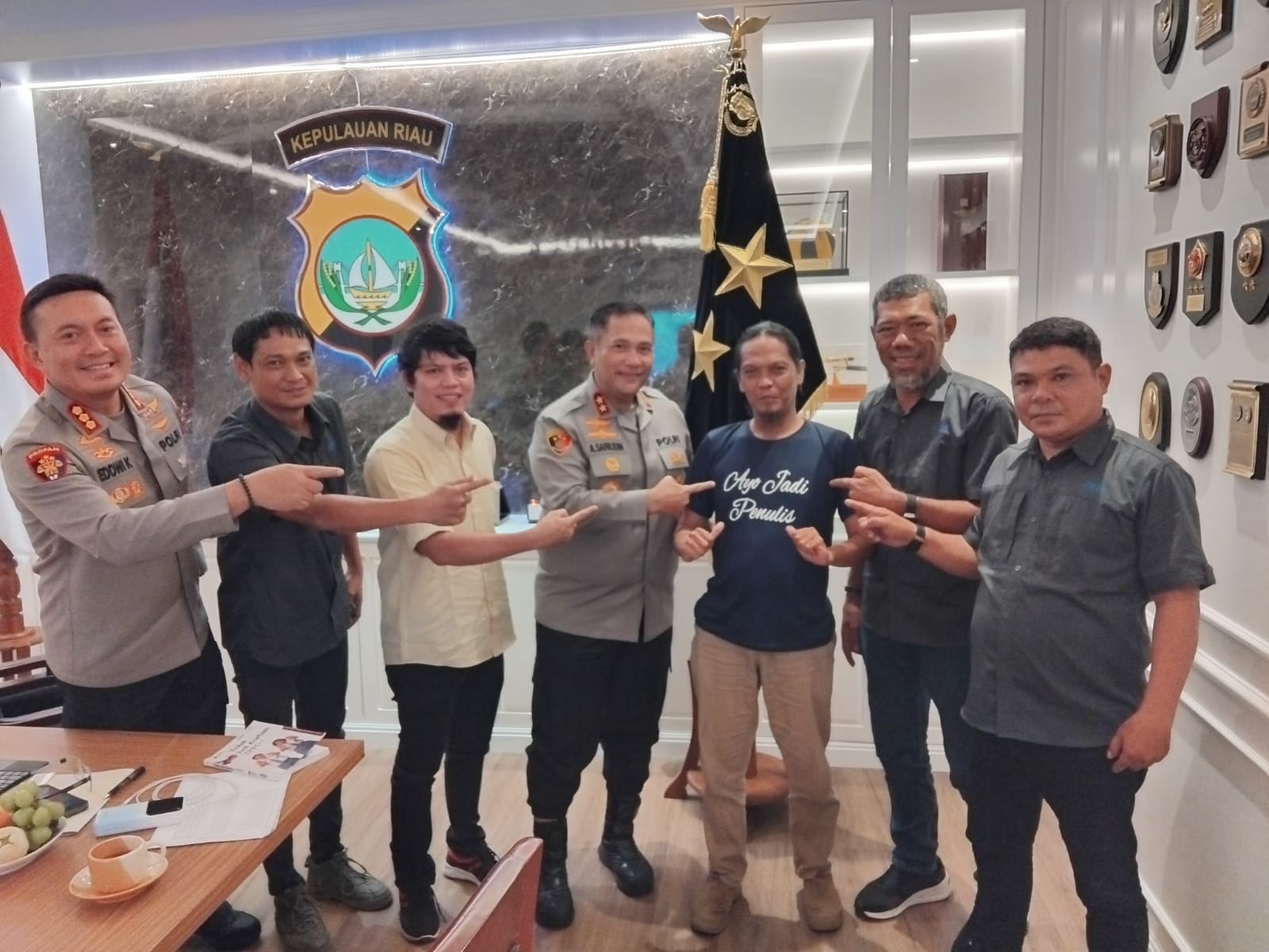 Pertemuan ini diakhiri dengan penandatangan pada lembaran kata Pengantar oleh Kapolda Kepri yang dianggap salah satu tokoh panting dalam buku tersebut dan sesi foto bersama.